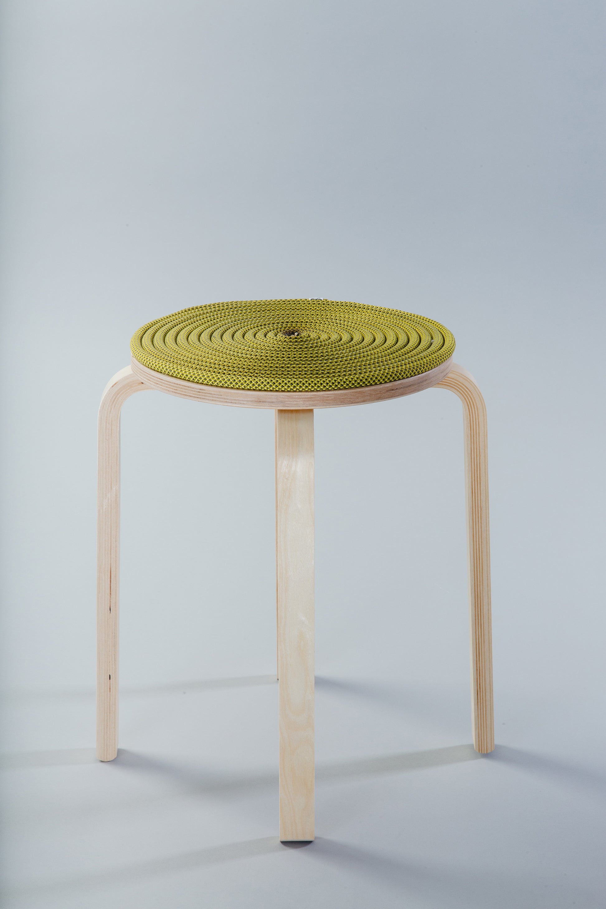 Material: Base made of old climbing ropes on a birchwood board, legs made of birchwood